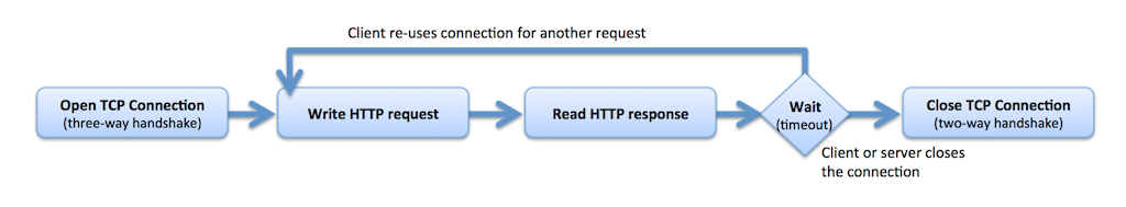 가장 간단한 구현에서 HTTP 클라이언트는 대상 서버에 대한 새로운 TCP 연결을 만들고 요청을 작성하고 응답을 받습니다. 그런 다음 서버는 TCP 연결을 닫아 리소스를 해제합니다.