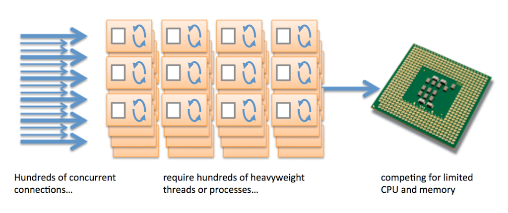 게다가, 이러한 웹 및 애플리케이션 서버는 일반적으로 각 연결에 대해 운영 체제 스레드 또는 프로세스를 할당합니다. TCP 연결은 매우 가벼운 운영 체제 객체이지만 스레드 또는 프로세스는 매우 무겁습니다. 스레드와 프로세스는 메모리를 필요로 하며 운영 체제에서 적극적으로 관리해야 하며 스레드 또는 프로세스 간의 '컨텍스트 전환'은 CPU를 소모합니다. 각 연결에 자체 스레드 또는 프로세스를 할당하는 것은 매우 비효율적입니다.
