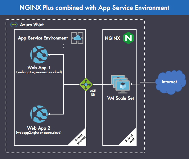 그림 3: NGINX Plus는 Azure ASE의 애플리케이션에 대한 트래픽 부하를 분산합니다.