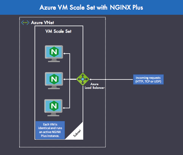 - Azure VM 스케일 세트 – VM 스케일 세트는 동일한 VM 세트를 배포하고 관리하는 데 사용할 수 있는 Azure 컴퓨팅 리소스입니다. VM의 크기를 구성하고 VM을 올바른 VNet에 할당할 수 있습니다. 스케일 세트 내부에서 실행되는 모든 VM은 VM 인스턴스 간에 TCP 연결을 제공하는 Azure Load Balancer에 의해 부하가 분산됩니다. 여기서 스케일 세트의 각 VM은 Azure Marketplace에서 제공되는 NGINX Plus 이미지를 기반으로 합니다. 스케일 세트는 진정한 자동 스케일링을 제공하도록 설계되었습니다.